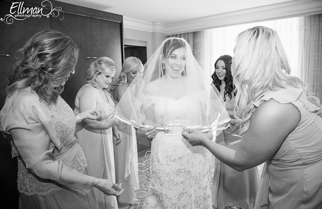 Jennifer's bridesmaids had so much fun helping her into her dress. I love their expressions.
